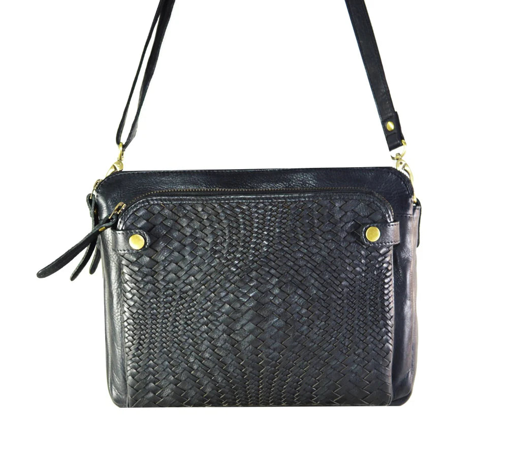 This multi-pocket cross-body computer bag features a braided front panel, making it unique and giving it a classic look. The interior is lined and has multiple compartments to keep it well organized.